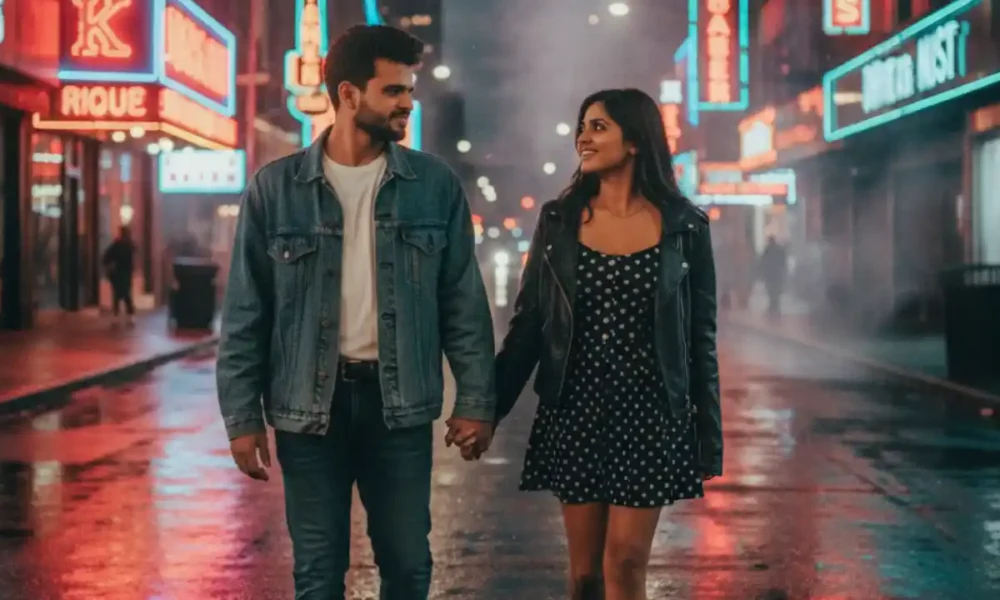 «Ένα νεαρό ζευγάρι πιασμένο χέρι χέρι, στέκεται κάτω από τα φώτα νέον ενός δρόμου της δεκαετίας του ’80, φορώντας μεγάλο τζιν μπουφάν και πουά φόρεμα, λαμπερές ανταύγειες στο βρεγμένο πεζοδρόμιο, εφέ ρετρό ταινίας, κινηματογραφική ατμόσφαιρα, ζεστούς νοσταλγικούς τόνους.»