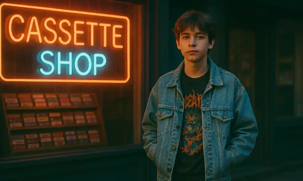 «Ένας έφηβος φορώντας μεγάλο τζιν μπουφάν, γραφικό μπλουζάκι και ψηλά αθλητικά παπούτσια, στέκεται κοντά σε ένα ρετρό κατάστημα κασετών, φώτα νέον λαμπερά, κοκκώδες φιλμ της δεκαετίας του ’80».