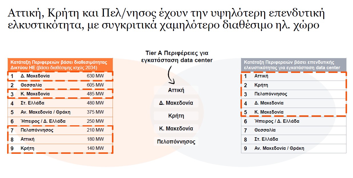 Πάντως, αν και αυτές πέντε περιφέρειες είναι εκείνες που ενεργειακά μπορούν πιο εύκολα να υποστηρίξουν μεγάλες επενδύσεις data centers, υπάρχει ανακολουθία μεταξύ ενεργειακής επάρκειας και επενδυτικής ελκυστικότητας. Η Αττική, η Κρήτη και η Πελοπόννησος εμφανίζονται πιο ελκυστικές για επενδύσεις, αλλά έχουν σημαντικά χαμηλότερη διαθέσιμη ισχύ στο δίκτυο.