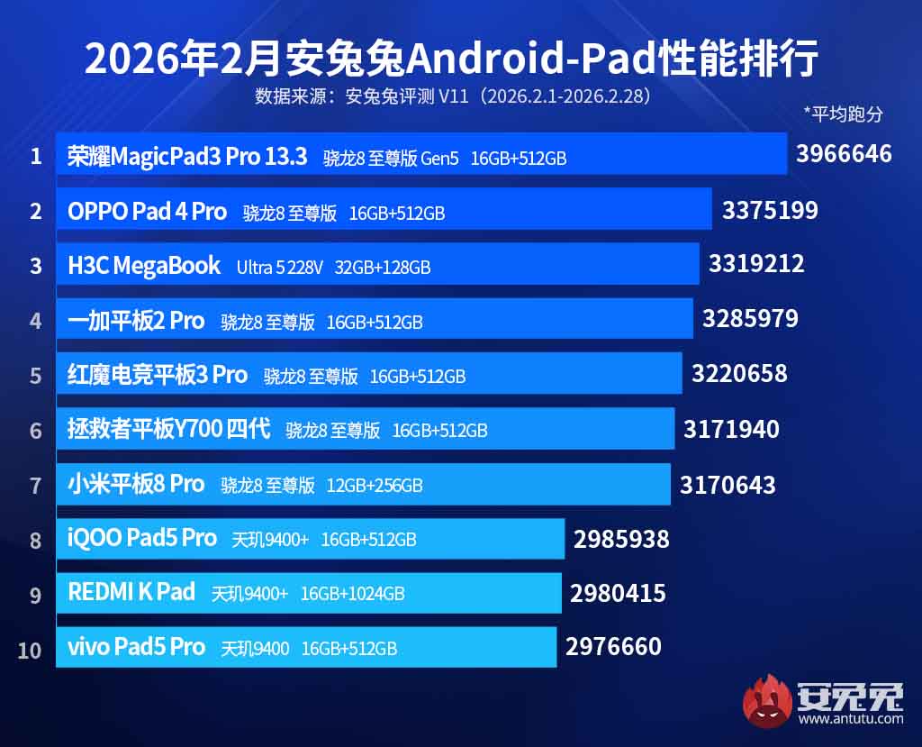 Εκτός από το Honor Power 2, το AnTuTu αποκάλυψε επίσης ότι το MagicPad 3 Pro προηγείται στην κατάταξη απόδοσης tablet, ακολουθούμενο από το OPPO Pad 4 Pro.