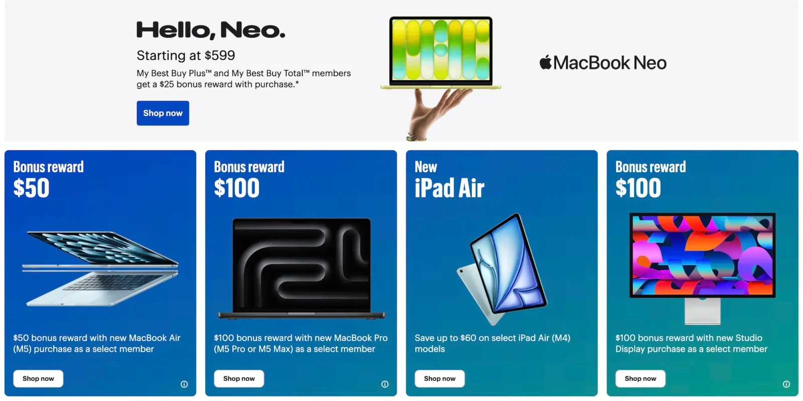 Όπως μπορείτε να δείτε παραπάνω, η Amazon προσφέρει μερικές κατευθείαν εκπτώσεις 50 $ σε μετρητά σε επιλεγμένα μοντέλα σήμερα. Αλλά στο Best Buy, Τα μέλη Plus και Total μπορούν να αποκτήσουν ανταμοιβές μπόνους $100 με αγορά σχεδόν σε κάθε μοντέλο, συμπεριλαμβανομένου του νέου Apple Studio Display XDR – αυτό περιλαμβάνει όλες τις επιλογές βάσης από την εμφάνισή του.