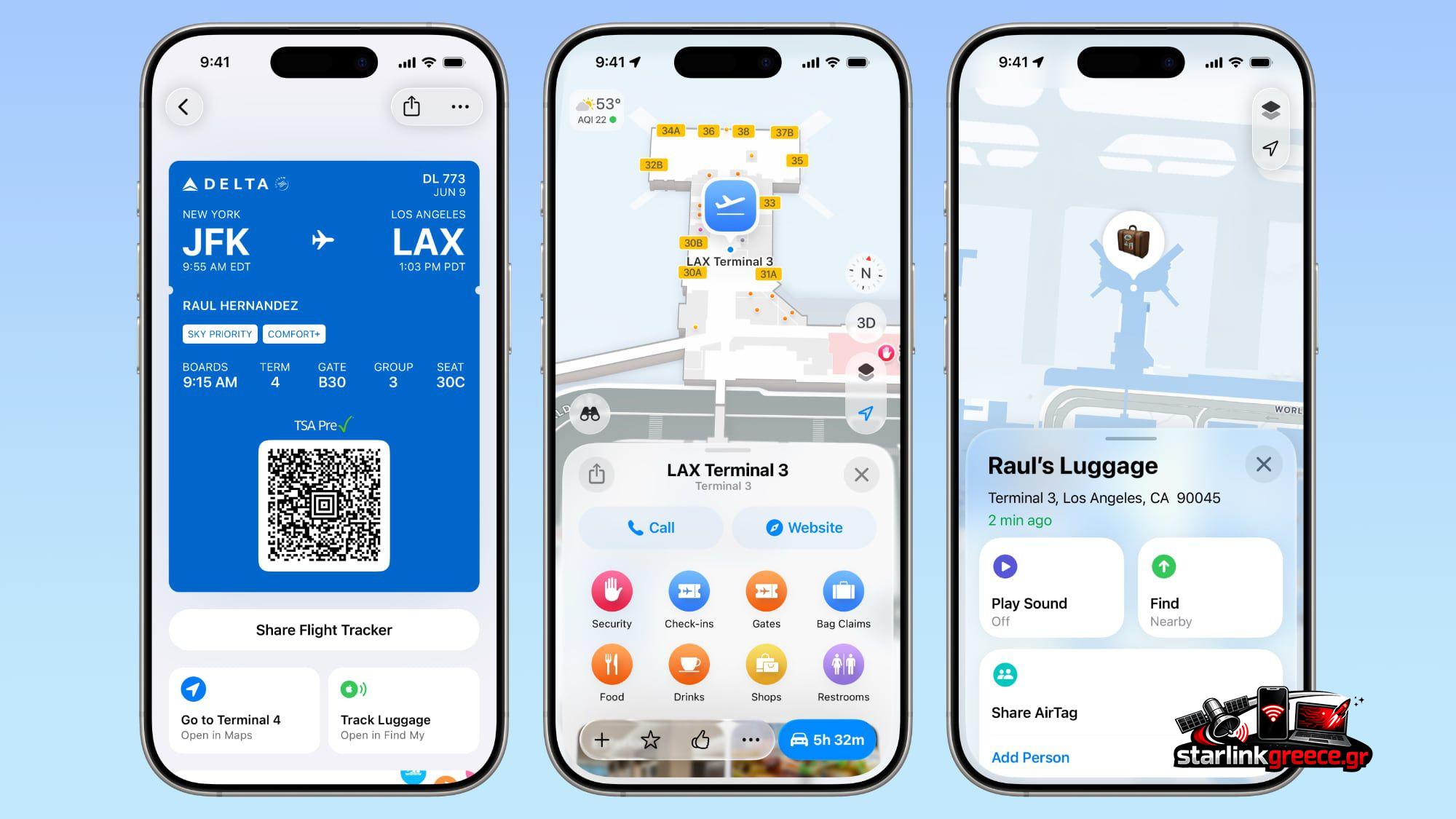 - Παρακολούθηση Αποσκευών: Οι επιβάτες μπορούν να παρακολουθούν τις αποσκευές τους μέσω της εφαρμογής Find My, εφόσον έχουν επισυνάψει ένα AirTag.