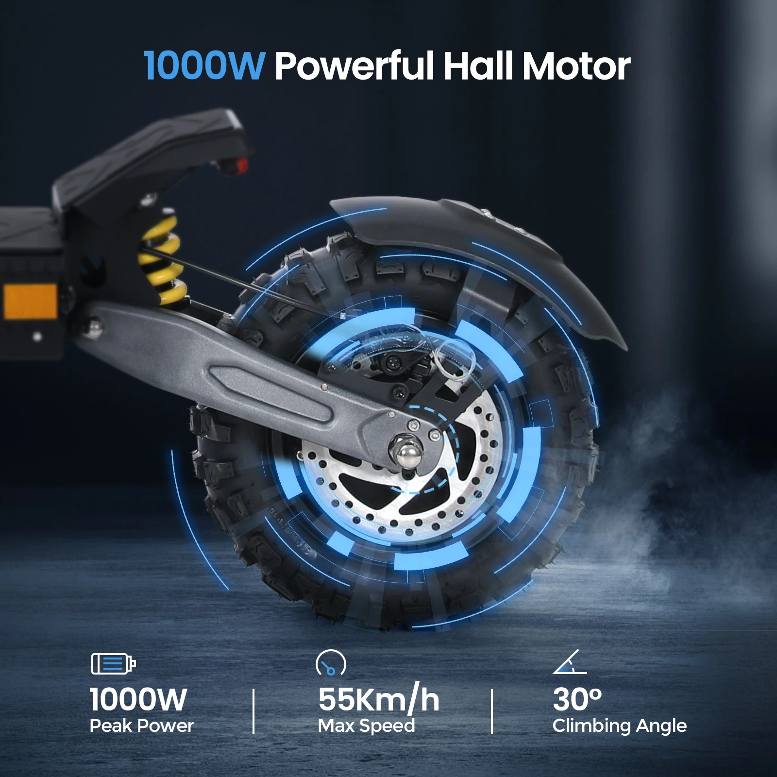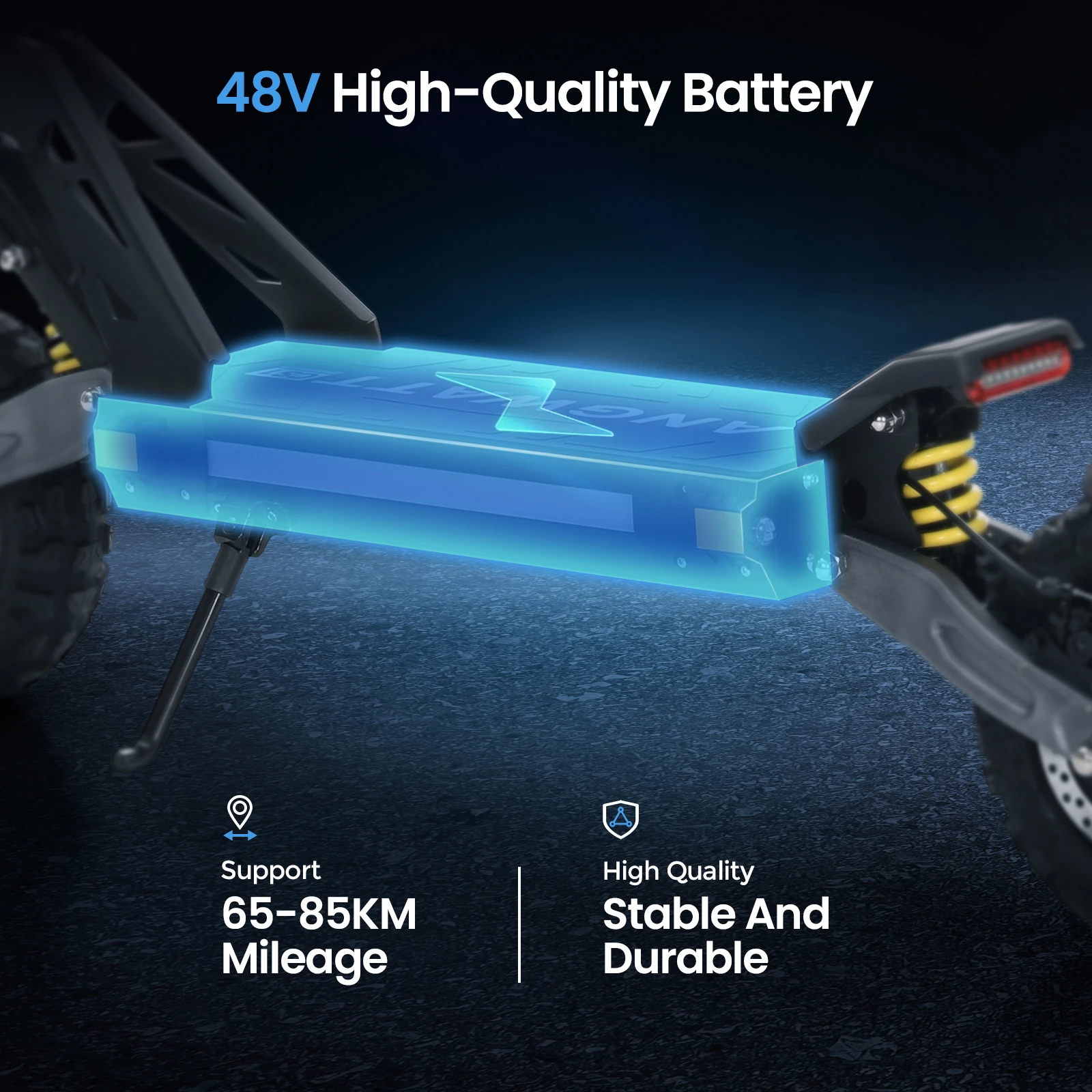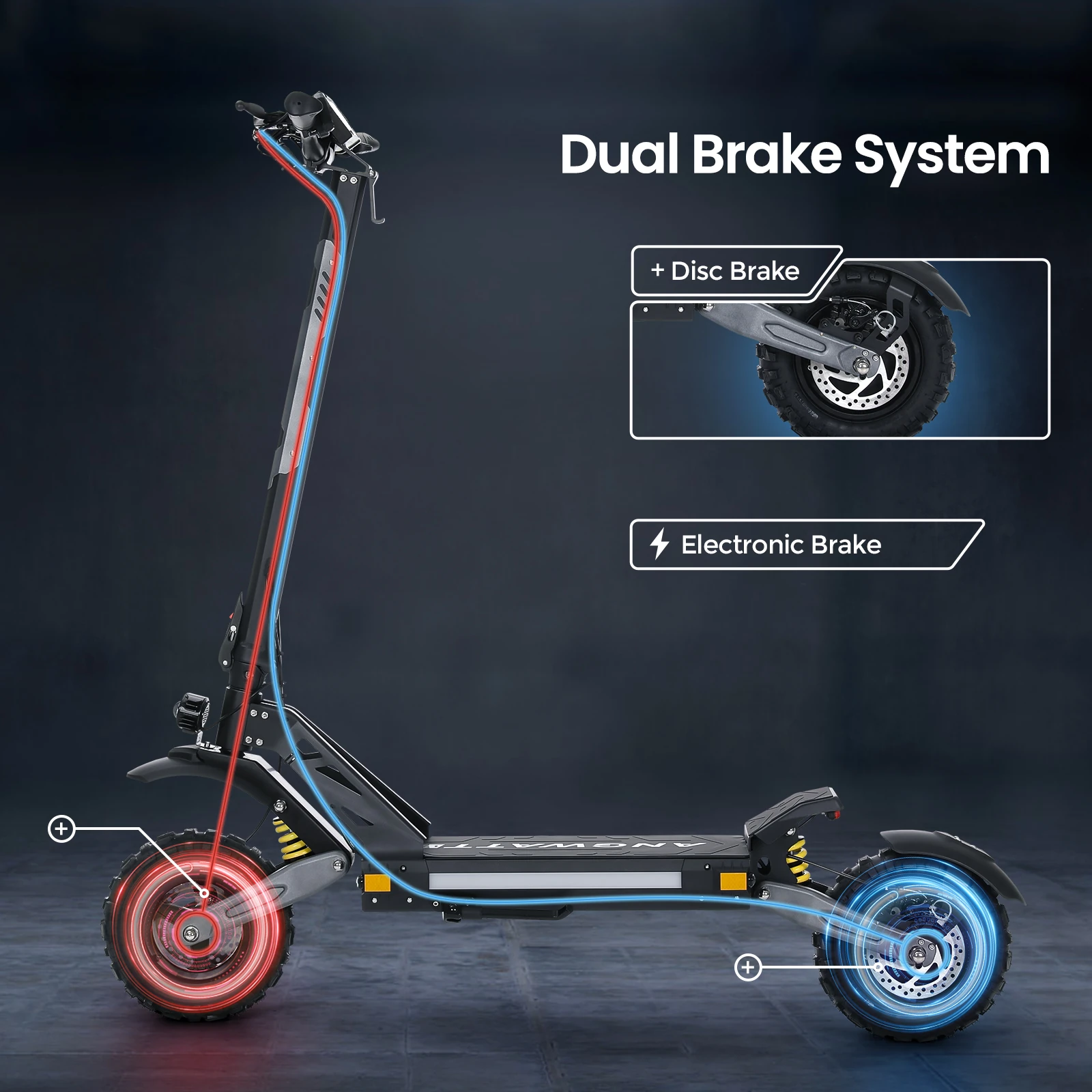 Στη άκρη των δύο αξόνων, θα βρείτε δύο πνευματικά ελαστικά 11″, φτιαγμένα για όλα τα οδοστρώματα, και εξοπλισμένα με υδραυλικά δισκόφρενα και υποβοήθηση απο Ε-ABS, που μπορούν να κοκκαλώσουν το ANGWATT CS1 σε μόλις 1 μέτρο σε στεγνό οδόστρωμα.