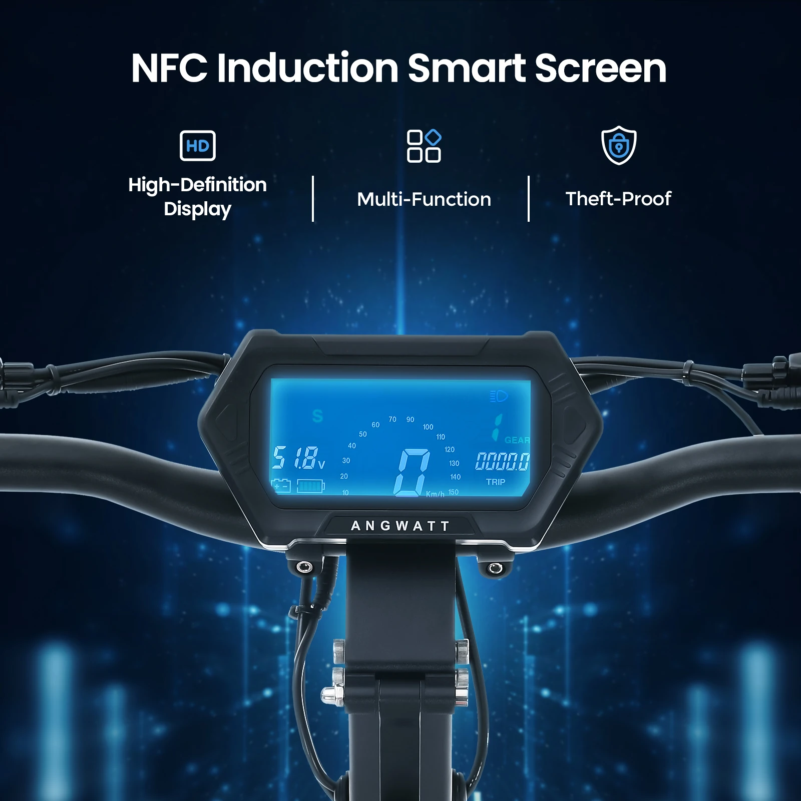 Το ANGWATT CS1 έχει μια μεγάλη, έγχρωμη οθόνη ενδείξεων στο τιμόνι, πίσω απο την οποία κρύβεται και ένας NFC Reader, με τον οποίο μπορείτε να ξεκλειδώσετε το πατίνι, χρησιμοποιώντας NFC κάρτες ή το κινητό σας.