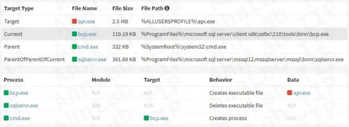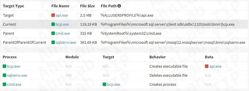Στη συνέχεια δημιουργείται κακόβουλο λογισμικό χρησιμοποιώντας το βοηθητικό πρόγραμμα BCP, το οποίο εξάγει ένα κακόβουλο δυαδικό αρχείο από τον πίνακα της βάσης δεδομένων uGnzBdZbsi σε τοπικό μονοπάτι ως api.exeκαθοδηγείται από ένα αρχείο μορφοποίησης με το όνομα FODsOZKgAU.txt — μια ρύθμιση που δεν έχει αλλάξει από το 2024.
