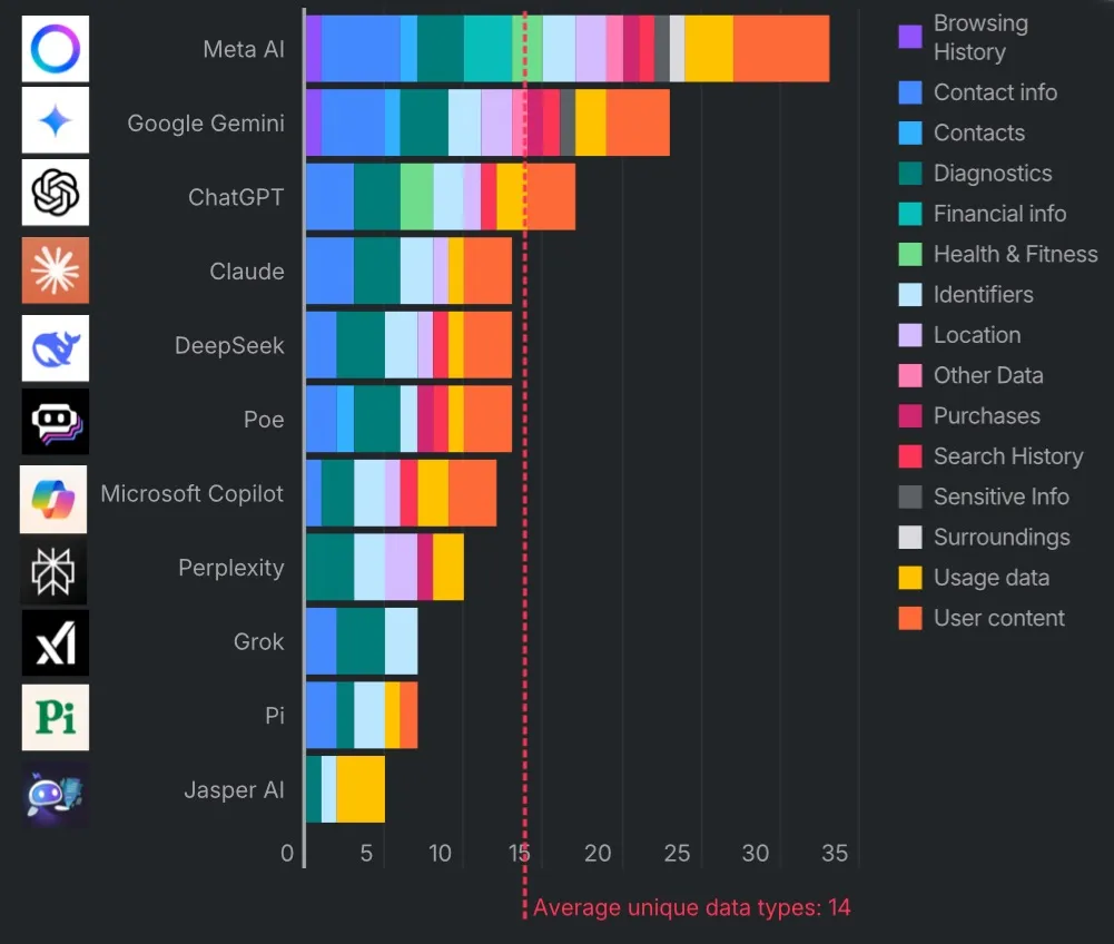 Η εταιρεία διαπίστωσε ότι, κατά μέσο όρο, τα chatbots AI συνέλεξαν 14 τύπους προσωπικών δεδομένων.