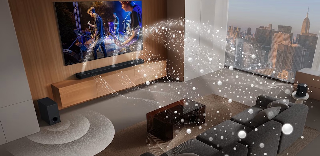 Ο ήχος είναι πραγματικά καθηλωτικός, χάρη στα τριπλά ηχεία up firing και το κεντρικό κανάλι up firing που προσφέρει πιο καθαρές φωνές και ιδανικό συγχρονισμό με την εικόνα, χωρίς καθυστερήσεις ή τρέμουλο. Η τεχνολογία χωρικού ήχου τριπλού επιπέδου δημιουργεί έναν εικονικό ηχητικό θόλο που αγκαλιάζει ομοιόμορφα το δωμάτιο, προσφέροντας μια μοναδική εμπειρία που θυμίζει κινηματογραφική αίθουσα.