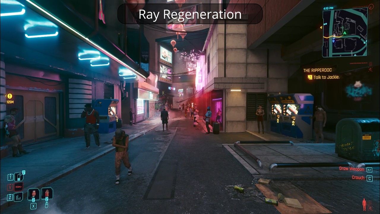 Το Ray Regeneration ξεπερνά κατά πολύ τον προεπιλεγμένο denoiser σε πολλές βασικές περιοχές. Η πιο σημαντική αναβάθμιση που παρέχει είναι ο πλουσιότερος παγκόσμιος φωτισμός, με πιο ρεαλιστικό έμμεσο φωτισμό. Παρέχει επίσης μεγαλύτερη ευκρίνεια στις αντανακλάσεις, ειδικά για τις μεταλλικές υφές (όπως μπορείτε να δείτε στο βίντεο που παραθέτω παρακάτω). Τέλος, ενισχύει την αλληλεπίδραση του φωτός με τα ογκομετρικά όπως η ομίχλη στην πρώτη σκηνή, παρέχοντας βελτιωμένη διάχυση.