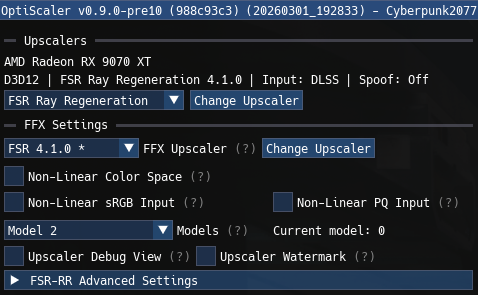 Αντιγράψτε τα εξαγόμενα αρχεία από τη δοκιμαστική έκδοση Opti στον εκτελέσιμο φάκελο του παιχνιδιού του Cyberpunk. Στη συνέχεια, αντικαταστήστε το Optiscaler.dll με το μεταγλωττισμένο Optiscaler.dll για το πιρούνι Ray Regeneration. Αντιγράψτε πάνω από το αρχείο amdxcffx64.dll για FSR 4.1 και amd_fidelityfx_framegeneration_dx12.dll. Στη συνέχεια, εκτελέστε το windows_setup, επιλέγοντας τις προεπιλεγμένες επιλογές με ενεργοποιημένη την πλαστογράφηση Nvidia (χωρίς Optipatcher). Μόλις μπείτε στο παιχνίδι, ενεργοποιήστε το Path Tracing και ενεργοποιήστε το DLSS Ray Reconstruction. Στη συνέχεια, στο μενού Optiscaler, επιλέξτε το FSR Ray Regeneration και το FSR 4.1.0 ως τα upscaler σας.