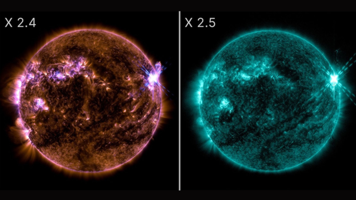 Η πρώτη φωτοβολίδα X2.4 εκτοξεύθηκε στις 9:07 μ.μ. EDT και η δεύτερη X2.5 ακολούθησε στις 4:13 π.μ. του επόμενου ημέρας. Παρά την έντασή τους, οι συγκεκριμένες εκλάμψεις δεν συγκαταλέγονται στις πιο ισχυρές που έχουν καταγραφεί από επιστήμονες στο παρελθόν.
