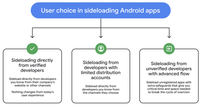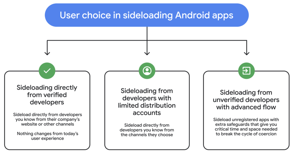 Προχωρώντας προς τα εμπρός, θα υπάρχουν 3 διαδρομές με βάση το πού λαμβάνετε τις εφαρμογές σας. Οι επαληθευμένοι προγραμματιστές θα μπορούν να διανέμουν ελεύθερα εφαρμογές από έναν ιστότοπο ή άλλα κανάλια. Τίποτα δεν αλλάζει από το πώς λειτουργεί το sideloading σήμερα. Οι περιορισμένοι λογαριασμοί διανομής θα μπορούν να δημοσιεύουν εφαρμογές για παράπλευρη φόρτωση σε μικρό αριθμό συσκευών (20 συνολικά) για εσωτερική δοκιμή. Στη συνέχεια, υπάρχει η νέα προηγμένη ροή για μη καταχωρημένες εφαρμογές.