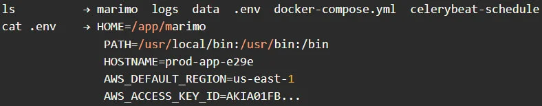 Στη συνέχεια, οι επιτιθέμενοι συνέχισαν τη διαδικασία αναγνώρισης ανακτώντας πληροφορίες για το περιβάλλον εργασίας τους με εντολές όπως pwd, whoami και ls. Στόχος τους ήταν η συλλογή διαπιστευτηρίων, με έμφαση σε αξίες όπως το αρχείο .env που περιέχει ευαίσθητες πληροφορίες σχετικά με διαπιστευτήρια και κλειδιά SSH.
