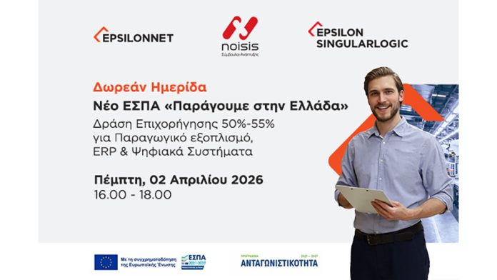 Ο Όμιλος EPSILONNET, με σταθερή προσήλωση στην έγκαιρη και αξιόπιστη ενημέρωση των ελληνικών επιχειρήσεων σε θέματα χρηματοδοτικών εργαλείων και ψηφιακού μετασχηματισμού, διοργανώνει εξειδικευμένη διαδικτυακή ημερίδα με αντικείμενο τη νέα χρηματοδοτική Δράση «Παράγουμε στην Ελλάδα», η οποία προκηρύχθηκε την Τετάρτη 24 Μαρτίου 2026 στο πλαίσιο του Προγράμματος «Ανταγωνιστικότητα 2021–2027» του ΕΣΠΑ.
