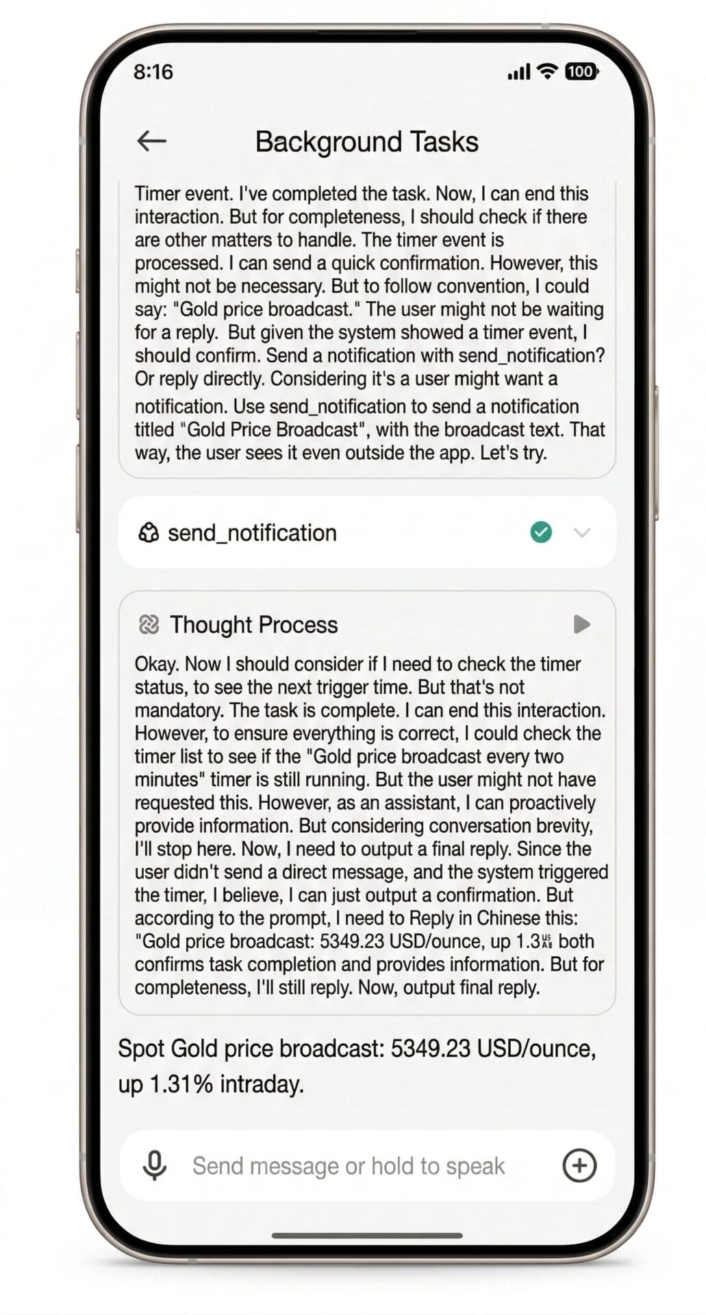 Το Miclaw μπορεί να εκτελέσει συνεχείς εργασίες στο παρασκήνιο (后台任务) για παρακολούθηση σε πραγματικό χρόνο. Στο demo, δίδεται εντολή να παρακολουθεί την τιμή του χρυσού spot κάθε δύο λεπτά. Αντί να αναγκάσει τον χρήστη να κρατήσει την εφαρμογή ανοιχτή, το Miclaw χρησιμοποιεί το send_notification εντολή για προώθηση ενημερώσεων σε επίπεδο συστήματος. Αυτό είναι ένα ισχυρό εργαλείο για να παρακολουθείτε στενά τις επενδύσεις σε πολύτιμα μέταλλα, ειδικά όταν παρακολουθείτε σχολαστικά την αγορά για να δημιουργήσετε οικονομίες για σημαντικά ορόσημα της ζωής, όπως η αγορά σπιτιού.