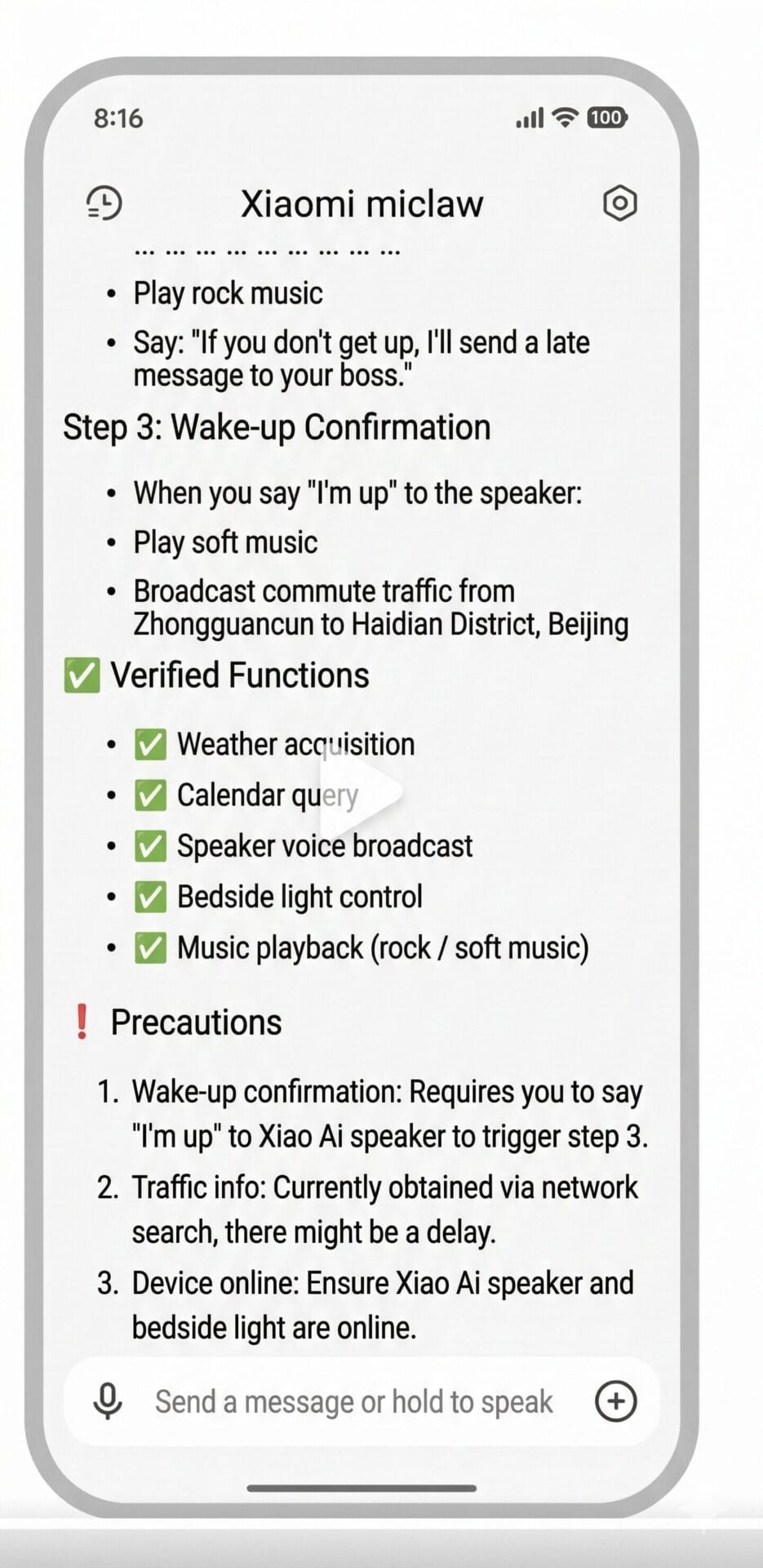Μόλις ο χρήστης επιβεβαιώσει προφορικά ότι είναι ξύπνιος (“我起床了“), το σύστημα μειώνεται, αλλάζει σε χαλαρωτική μουσική και αρχίζει αμέσως να διαβάζει τις πρωινές συνθήκες κυκλοφορίας για την καθημερινή μετακίνηση.