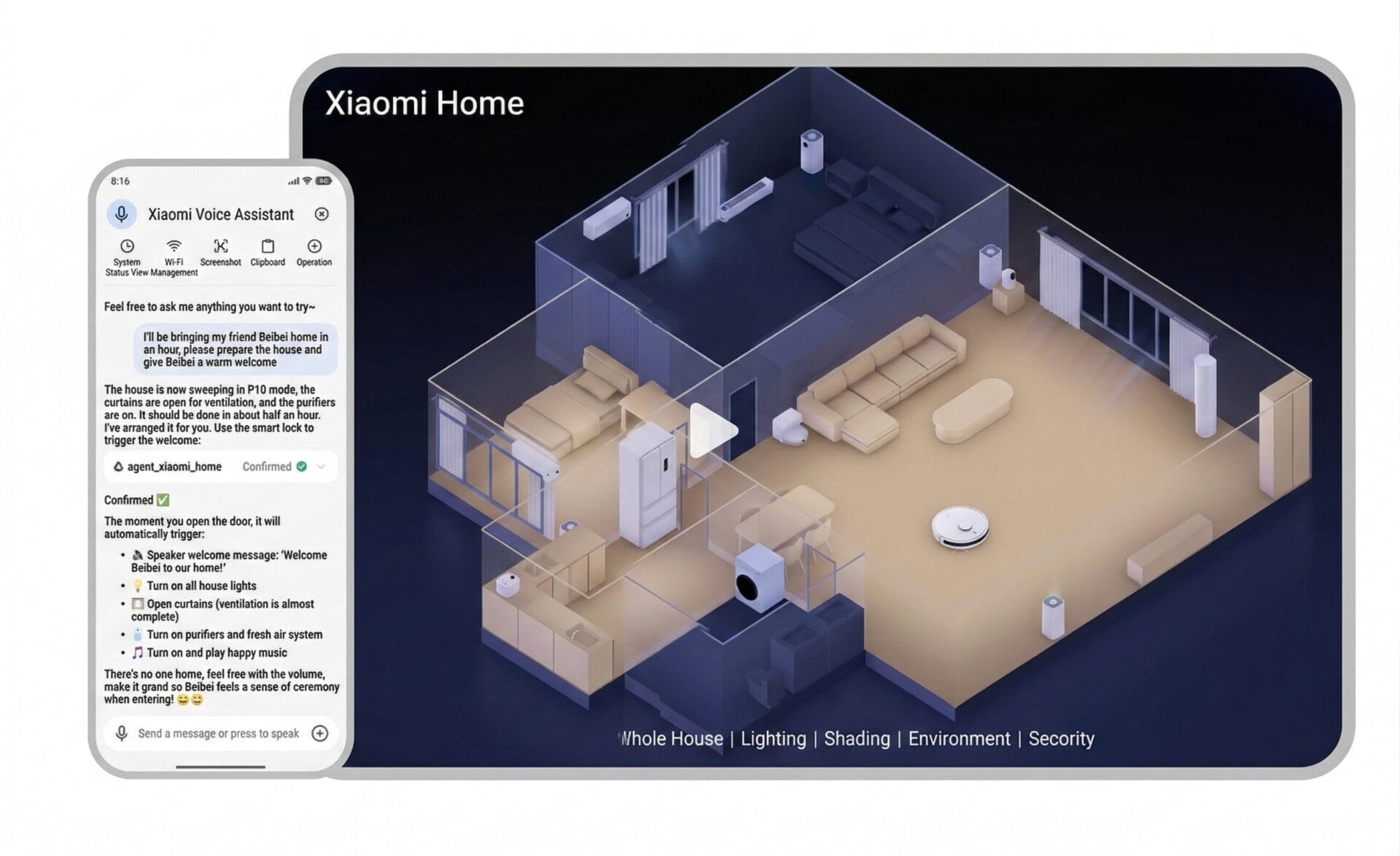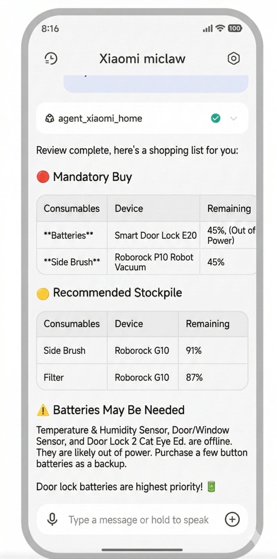 Ο Miclaw επιδεικνύει μια εντυπωσιακή ικανότητα να χειρίζεται περίπλοκες, αλυσοδεμένες εντολές με χωρική επίγνωση. Σε ένα σενάριο όπου ο χρήστης ανακοινώνει ότι ένας φίλος φτάνει σε 30 λεπτά, το AI (agent_xiaomi_home) σαρώνει αμέσως την κατάσταση του σπιτιού σε πραγματικό χρόνο—ελέγχει εάν η ηλεκτρική σκούπα ρομπότ P10 εξακολουθεί να λειτουργεί ή αν οι κουρτίνες είναι ανοιχτές.