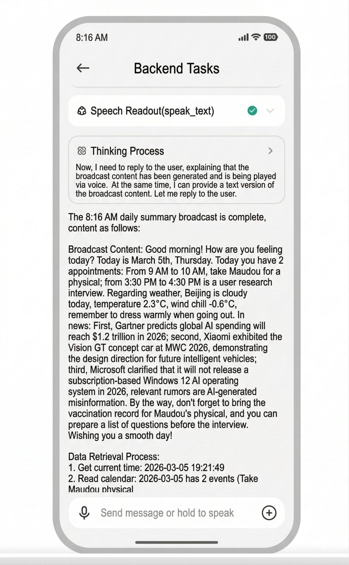 Το demo “Thought Process” (思考过程) τα αρχεία καταγραφής δείχνουν τον Miclaw να ενεργεί ως προσωπικό πρακτορείο ειδήσεων. Στις 8:16 π.μ., αντλεί δεδομένα από το ημερολόγιο (πρωινό ραντεβού με κτηνίατρο, απογευματινή συνέντευξη) και την εφαρμογή καιρού. Στη συνέχεια, το συνθέτει με πολύ συγκεκριμένες τεχνολογικές ειδήσεις —όπως οι προβλέψεις δαπανών τεχνητής νοημοσύνης της Gartner για το 2026, οι φήμες για τα Windows 12 και ενημερώσεις για το πρωτότυπο αυτοκίνητο Xiaomi Vision GT από το MWC 2026—παρέχοντας μια περιεκτική πρωινή σύντομη ενημέρωση με ένα μόνο κείμενο.