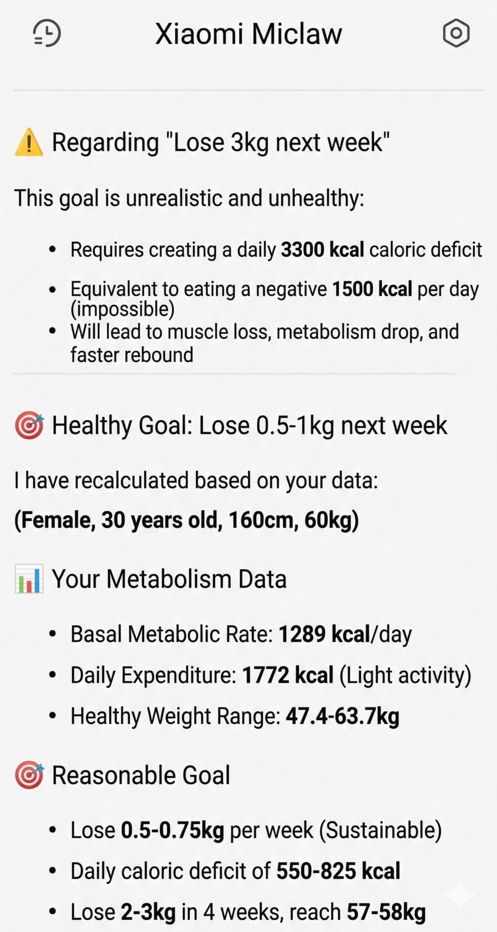Όταν δίνεται μια επιθετική εντολή να «χάσετε 3 κιλά την επόμενη εβδομάδα», η τεχνητή νοημοσύνη σπρώχνει πίσω, εξηγώντας ότι η δημιουργία ημερήσιου ελλείμματος 3.500 θερμίδων είναι ανθυγιεινή και οδηγεί σε απώλεια μυών. Αντίθετα, υπολογίζει έναν εξατομικευμένο βασικό μεταβολικό ρυθμό. Για οποιονδήποτε σε ένα σταθερό ταξίδι φυσικής κατάστασης – ας πούμε, μειώνοντας τα 105 κιλά σε έναν πιο υγιεινό στόχο 90 κιλών – ο Miclaw υπολογίζει εκ νέου έναν βιώσιμο στόχο απώλειας 0,5 έως 1 κιλού την εβδομάδα, δίνοντας προτεραιότητα στη μακροπρόθεσμη υγεία σε σχέση με τις δίαιτες τρακαρισμένων.