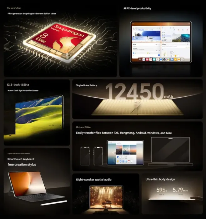 Είναι το πρώτο tablet στον κόσμο που τροφοδοτείται από το πιο πρόσφατο Snapdragon 8 Elite Gen 5 SoC. Υπάρχει ο επεξεργαστής HONOR Phantom Engine 3.0, εξαιρετικά λεπτός ανοξείδωτος VC με αμφίδρομη κυκλοφορία αερίου-υγρού, συνολική επιφάνεια απαγωγής θερμότητας 65485 mm² και η πρώτη τεχνολογία Q-Sync σε επίπεδο υπολογιστή.