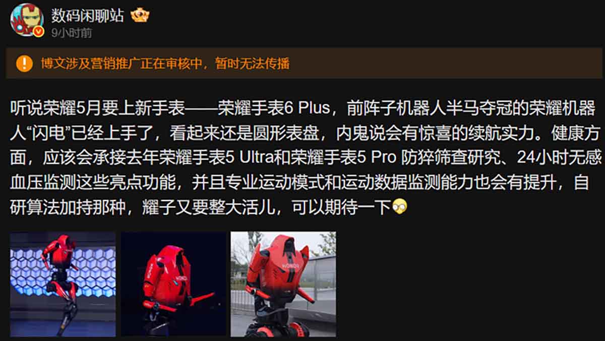 Σύμφωνα με πληροφορίες από τον γνωστό tipster DigitalChatStation, το Honor Watch 6 Plus έχει ήδη δοκιμαστεί σε διάφορες συνθήκες, συμπεριλαμβανομένης της εκδήλωσης με το ρομπότ «Lightning», το οποίο ενθουσίασε το κοινό με την ικανότητά του να ολοκληρώνει ημιμαραθώνιο φορώντας το .