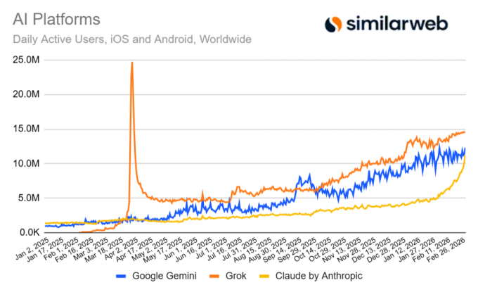 Σε αυτό το μέτωπο, ένας άλλος πάροχος πληροφοριών αγοράς, Παρόμοιος Ιστόςδιαπίστωσε ότι η εφαρμογή του Claude σε συσκευές iOS και Android είχε 11,3 εκατομμύρια ενεργούς χρήστες καθημερινά στις 2 Μαρτίου, αύξηση 183% από την αρχή του έτους, όταν η χρήση ήταν περίπου 4 εκατομμύρια, και από 5 εκατομμύρια ημερήσιους ενεργούς χρήστες στις αρχές Φεβρουαρίου.