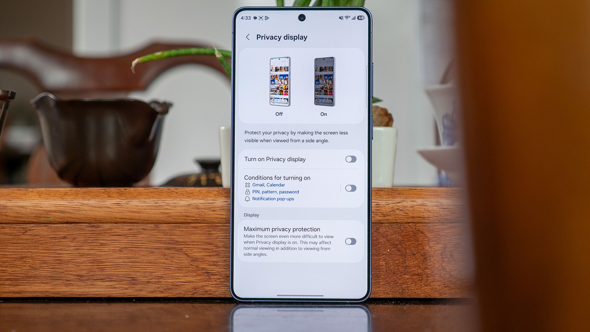 Για το μεγαλύτερο απόρρητο, οι χρήστες μπορούν προαιρετικά να ενεργοποιήσουν Μέγιστη προστασία απορρήτου ώστε να είναι σχεδόν αδύνατο να δείτε τα περιεχόμενα της οθόνης από άλλες οπτικές γωνίες. Υπάρχει μια σύλληψη — αυτή η λειτουργία προσθέτει μια μεταλλική απόχρωση σε ολόκληρη την οθόνη σας και ξεπλένει έντονα τα χρώματα, ακόμα και όταν τα βλέπετε απευθείας. Δείτε πώς μπορείτε να το ενεργοποιήσετε: