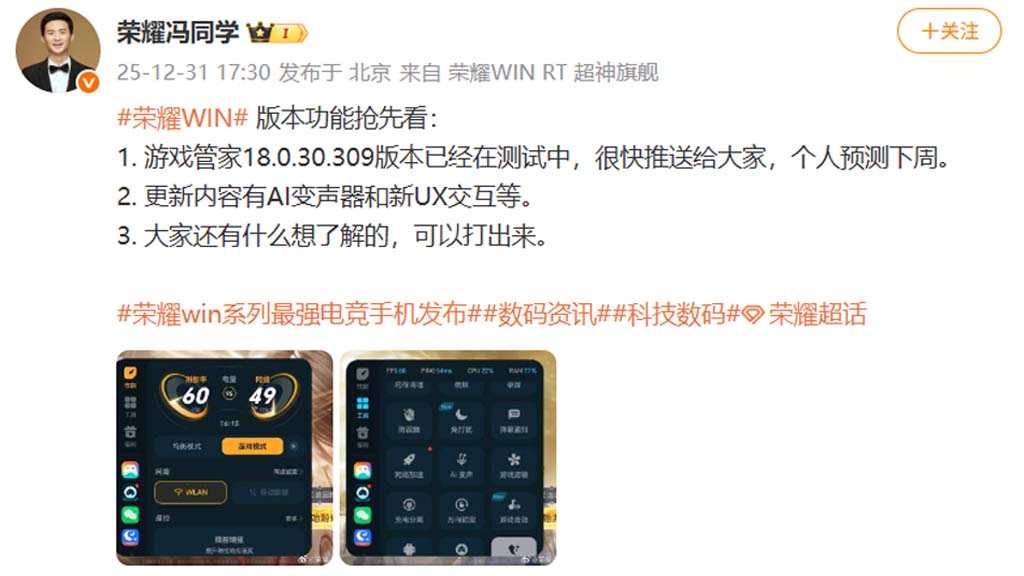 Οι Μηχανικοί Ε&Α της Honor αποκάλυψαν μια νέα ενημέρωση για τη σειρά WIN που θα κάνει το ντεμπούτο της την επόμενη εβδομάδα. Θα ανανεώσει το Game Manager με την έκδοση 18.0.30.309.