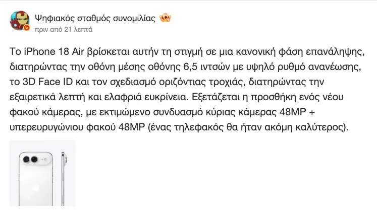 Σύμφωνα με τον γνωστό διαρρήκτη Ψηφιακός σταθμός συνομιλίας (DCS)Μήλο δουλεύει ήδη ενεργοποιημένο iPhone 18 Airένα μοντέλο που φαίνεται να ακολουθεί τη φιλοσοφία του «επαναπροσδιορισμού της μεσαίας κατηγορίας» για τη σειρά iPhone. Αν κρίνουμε από τη διαρροή, η συσκευή βρίσκεται σε κανονική φάση επανάληψης, με στόχο να συνδυαστεί ελαφρύ, υψηλή οθόνη και κάμερα επιπέδου Proαλλά σε πιο «προσιτή» τιμή.