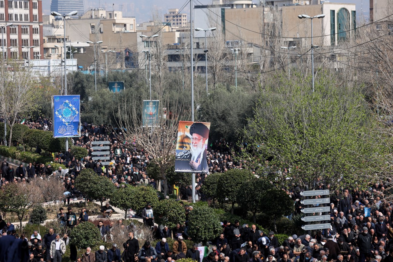 Μουσουλμάνοι συμμετέχουν σε προσευχή ενώ προβάλλεται εικόνα του εκλιπόντος ανώτατου ηγέτη του Ιράν, Αγιατολάχ Αλί Χαμενεΐ, ο οποίος σκοτώθηκε σε ισραηλινά και αμερικανικά πλήγματα, εν μέσω της σύγκρουσης ΗΠΑ–Ισραήλ με το Ιράν, στην Τεχεράνη, 6 Μαρτίου 2026.
