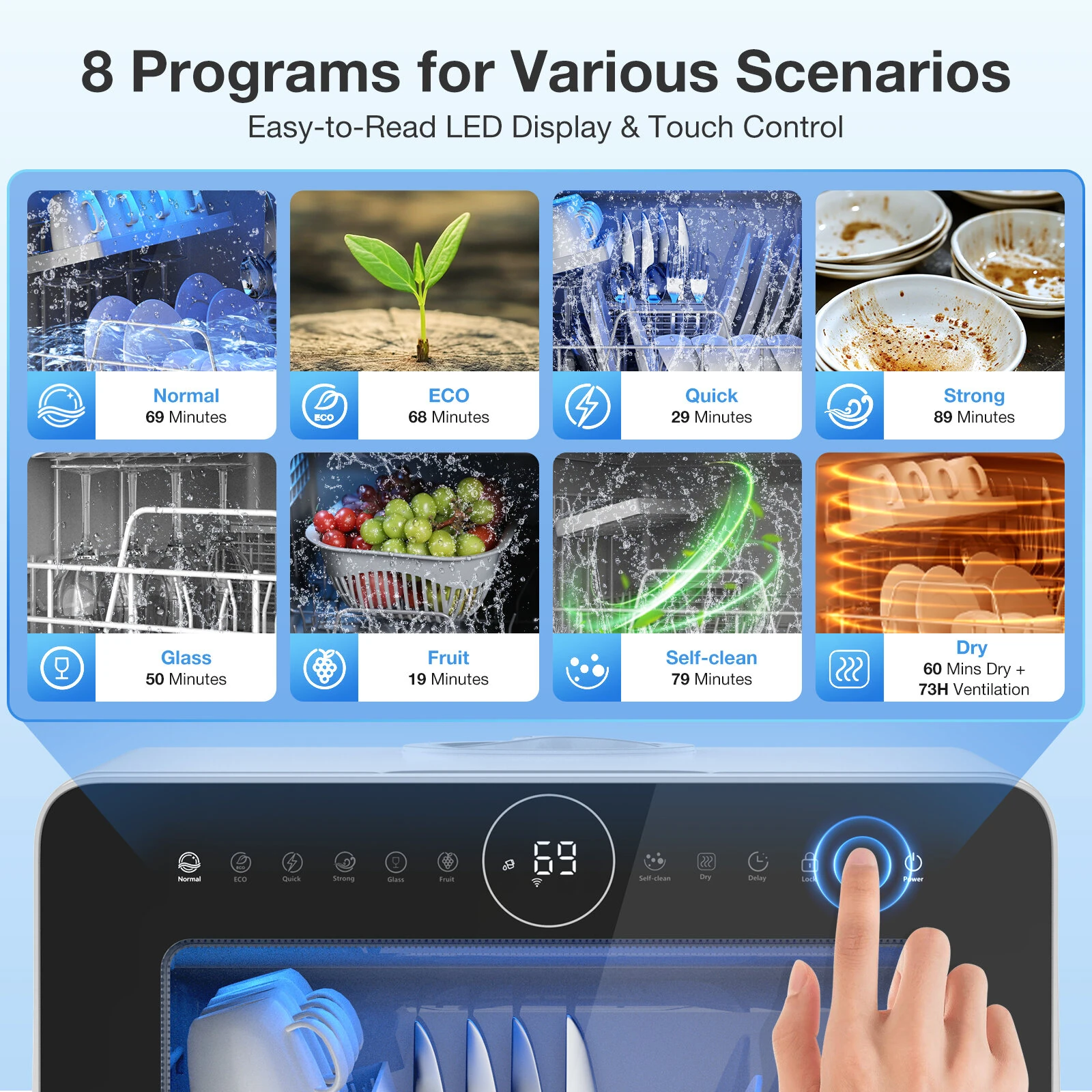 Παρά το μέγεθός του, δεν κάνει εκπτώσεις στις δυνατότητες. Έρχεται με 8 διαφορετικά προγράμματα πλυσίματος, καλύπτοντας κάθε ανάγκη – από απλό φρεσκάρισμα μέχρι πιο εντατικό καθάρισμα. Η λειτουργία 3D 360° dual spray εξασφαλίζει ότι το νερό φτάνει παντού, ενώ το hot air drying βοηθάει να στεγνώνουν τα σκεύη χωρίς υγρασία και σταγόνες.