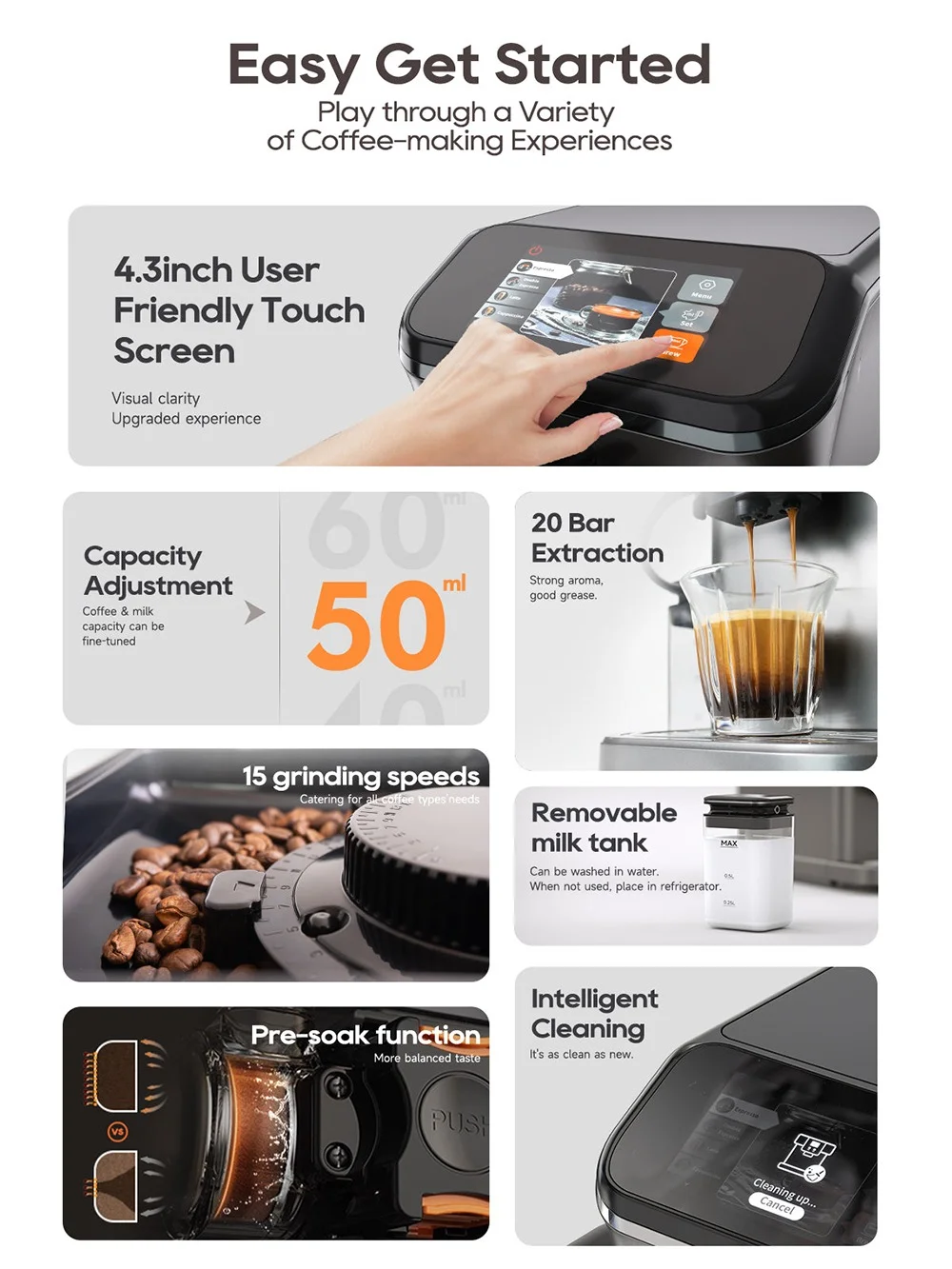 Ο μύλος άλεσης προσφέρει πολλαπλά επίπεδα ρύθμισης για το πάχος του αλεσμένου καφέ, προσαρμόζοντας την άλεση στις προτιμήσεις σου και τον τύπο καφέ που χρησιμοποιείς. Το δοχείο νερού και οι δεξαμενές για κόκκους και κατακάθια είναι εύκολα προσβάσιμα και αποσπώμενα, για εύκολη χρήση και συντήρηση.