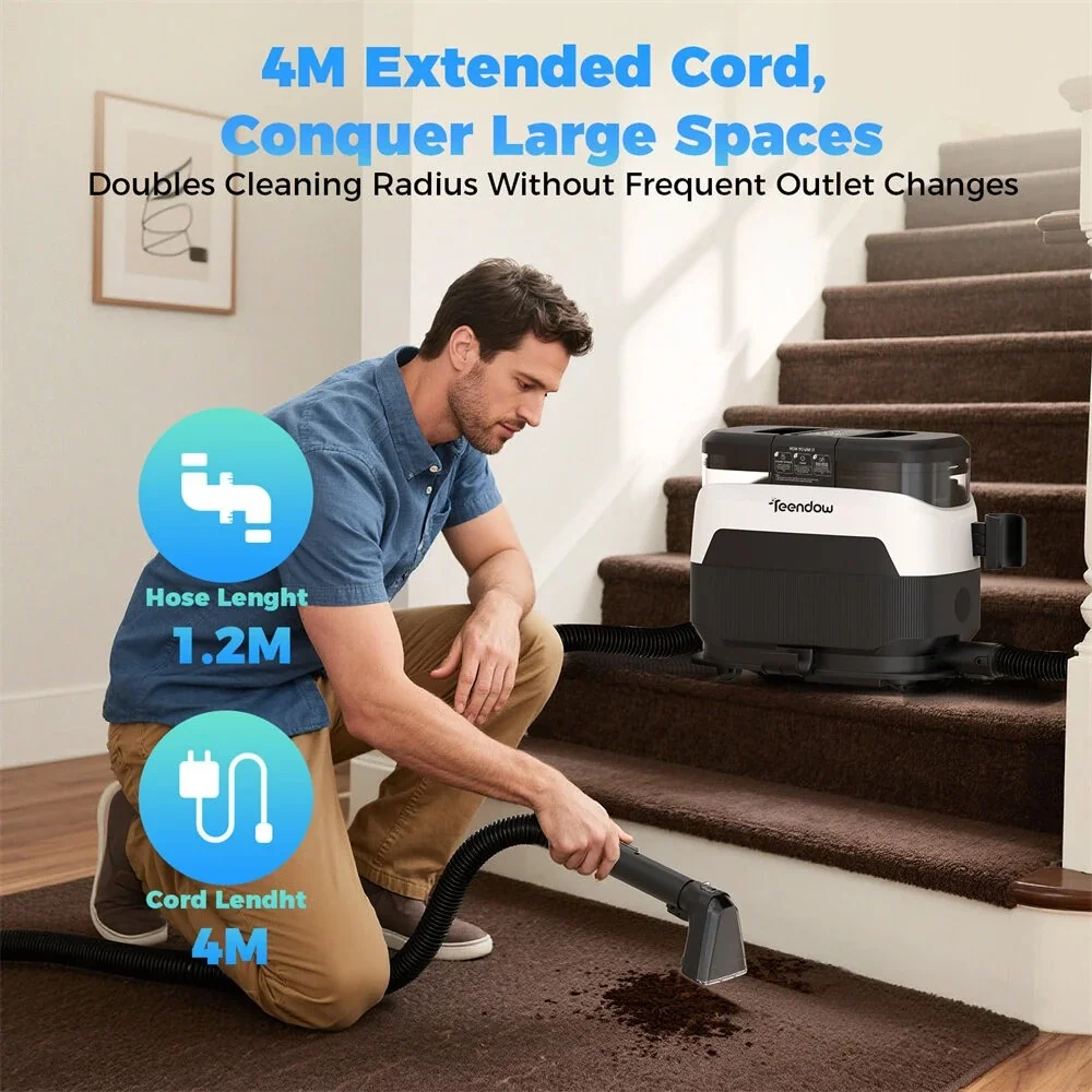 Ο Teendow C6 MAX είναι μια φορητή συσκευή καθαρισμού χαλιών και υφασμάτων που έρχεται να καλύψει ένα μεγάλο κενό: την ανάγκη για αποτελεσματικό καθαρισμό χωρίς επαγγελματία. Με ισχύ 1650W, απορροφητική δύναμη 12kPa και δυνατότητα παραγωγής υψηλής θερμοκρασίας ατμού, η C6 MAX δεν περιορίζεται σε ένα γρήγορο πέρασμα – καθαρίζει σε βάθος.