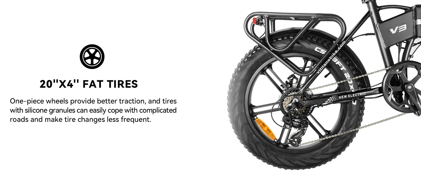 Το Vitilan V3 2.0 έχει έτσι και αλλιώς μικρό σκελετό, με τα ελαστικά 20″ x 4″, τα οποία σαν γνήσια ελαστικά για fatbike είναι σχεδιασμένα για να λειτουργούν με χαμηλή πίεση αέρα, προσφέροντας μεγάλη επιφάνεια επαφής με το δρόμο, και καλύτερη πρόσφυση σε όλα τα τερέν.