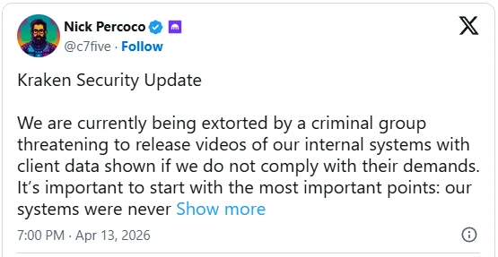 Ο Percoco δήλωσε: «Αυτή τη στιγμή εκβιαζόμαστε από μια εγκληματική ομάδα που απειλεί να δημοσιοποιήσει βίντεο των εσωτερικών μας συστημάτων στα οποία εμφανίζονται δεδομένα πελατών, εάν δεν συμμορφωθούμε με τις απαιτήσεις τους». Ζήτησε από τους χρήστες του Kraken να διαπραγματευτούν με την εγκληματική ομάδα, επαναλαμβάνοντας, «Τα συστήματά μας δεν παραβιάστηκαν ποτέ, τα κεφάλαια δεν κινδύνευσαν ποτέ, δεν θα πληρώσουμε ούτε θα διαπραγματευτούμε με αυτούς τους εγκληματίες». Αυτή η τονισμένη στάση αναδεικνύει τη δέσμευση της Kraken να προστατεύσει την ακεραιότητα του χρηματιστηρίου και των πελατών του.