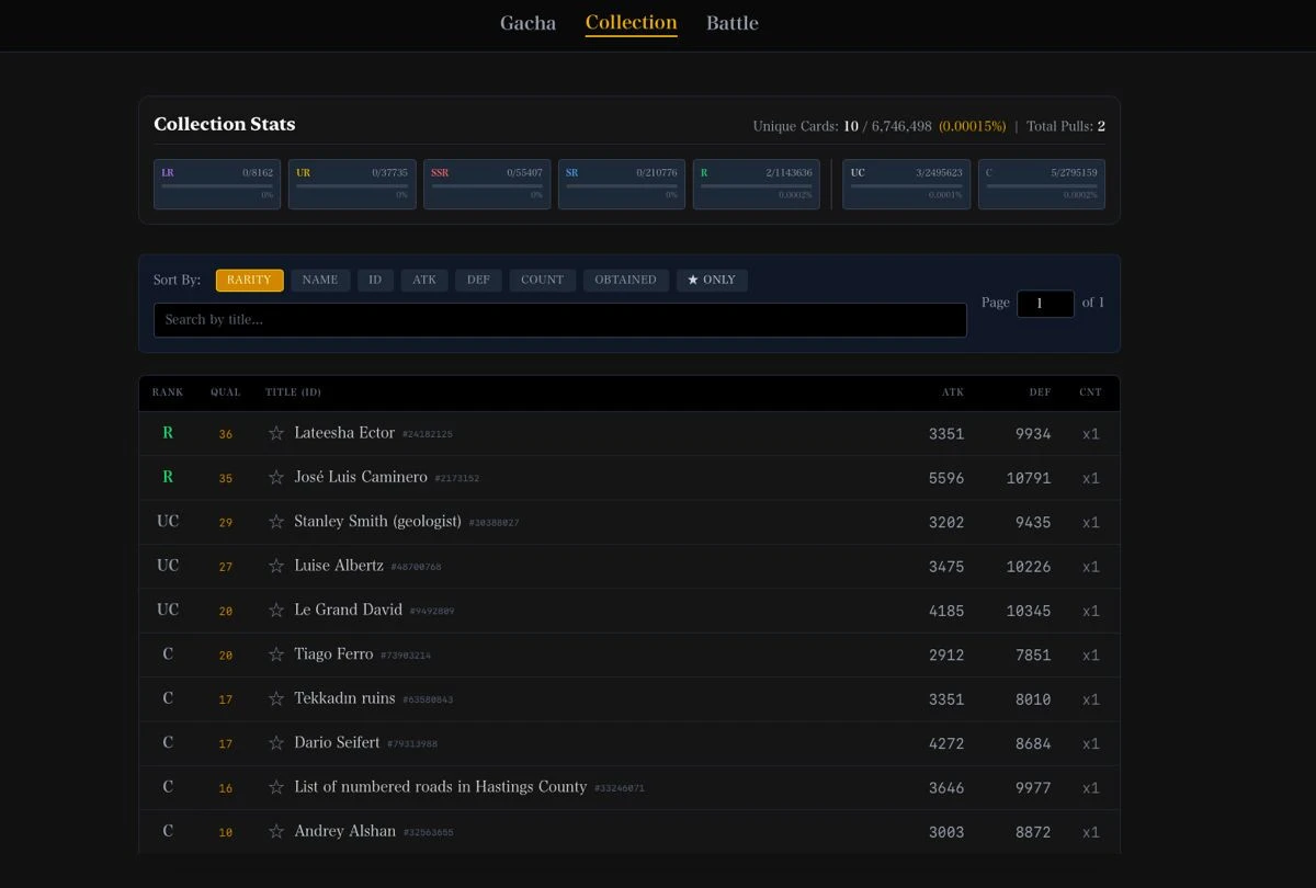 Το στοιχείο που καθιστά το Wikigacha ένα εξαιρετικό δείγμα game design είναι το σύστημα αξιολόγησης και τα στατιστικά των καρτών. Η Επίθεση (ATK) και η Άμυνα (DEF) δεν αποδίδονται τυχαία (RNG), αλλά μεταφράζονται από πραγματικά, μετρήσιμα δεδομένα της Wikipedia. Συγκεκριμένα, η Επίθεση (ATK) υπολογίζεται με βάση τη δημοτικότητα του άρθρου (αριθμός προβολών / pageviews), πολλαπλασιασμένη με έναν δείκτη σπανιότητας, έχοντας ως ανώτατο όριο τους 15.000 πόντους. Αντίστοιχα, η Άμυνα (DEF) καθορίζεται αυστηρά από το μέγεθος του κειμένου. Επομένως, ένα μακροσκελές, ακαδημαϊκού επιπέδου άρθρο θα διαθέτει τεράστια αμυντική ικανότητα, ενώ ένα άρθρο της ποπ κουλτούρας που διαβάζεται μαζικά θα διαθέτει συντριπτική επιθετική ισχύ.