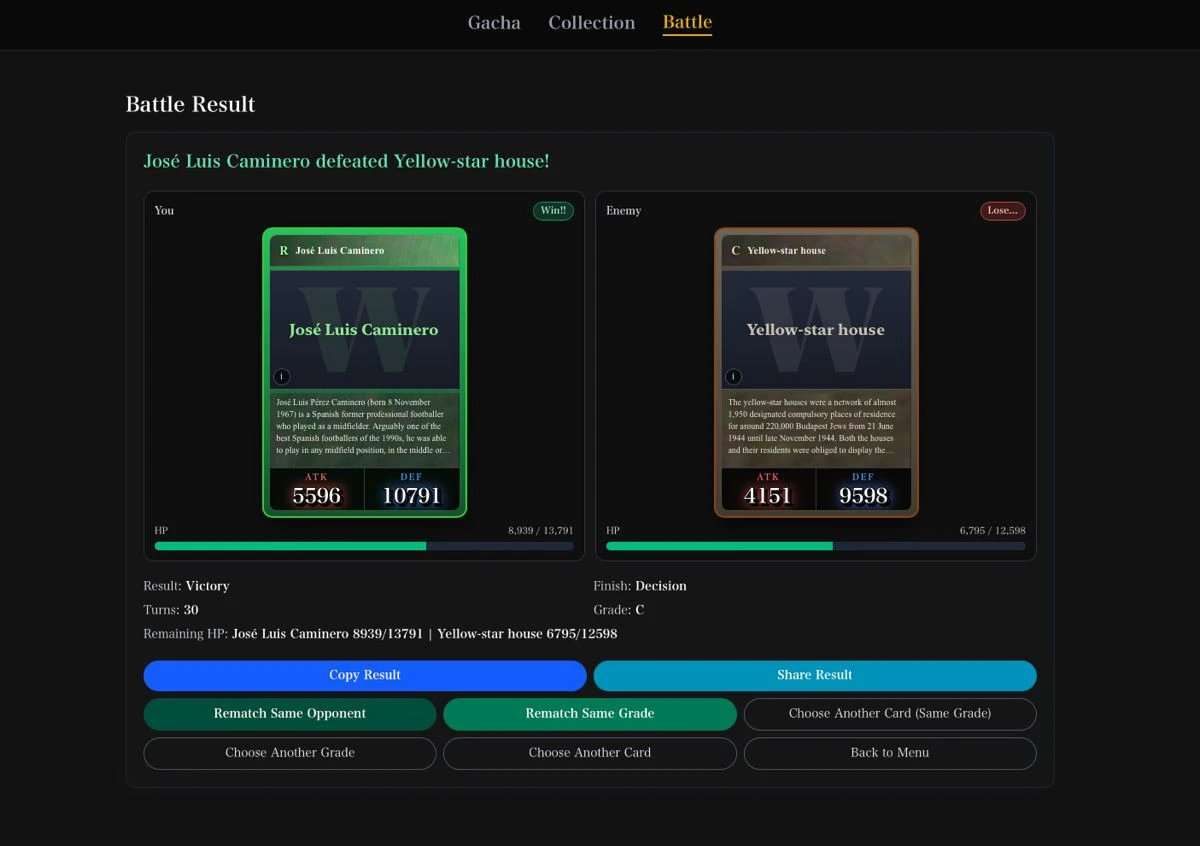 - Τα στατιστικά μάχης κάθε κάρτας προκύπτουν από πραγματικά δεδομένα: Η Επίθεση (ATK) βασίζεται στα pageviews και η Άμυνα (DEF) στο μήκος του κειμένου.