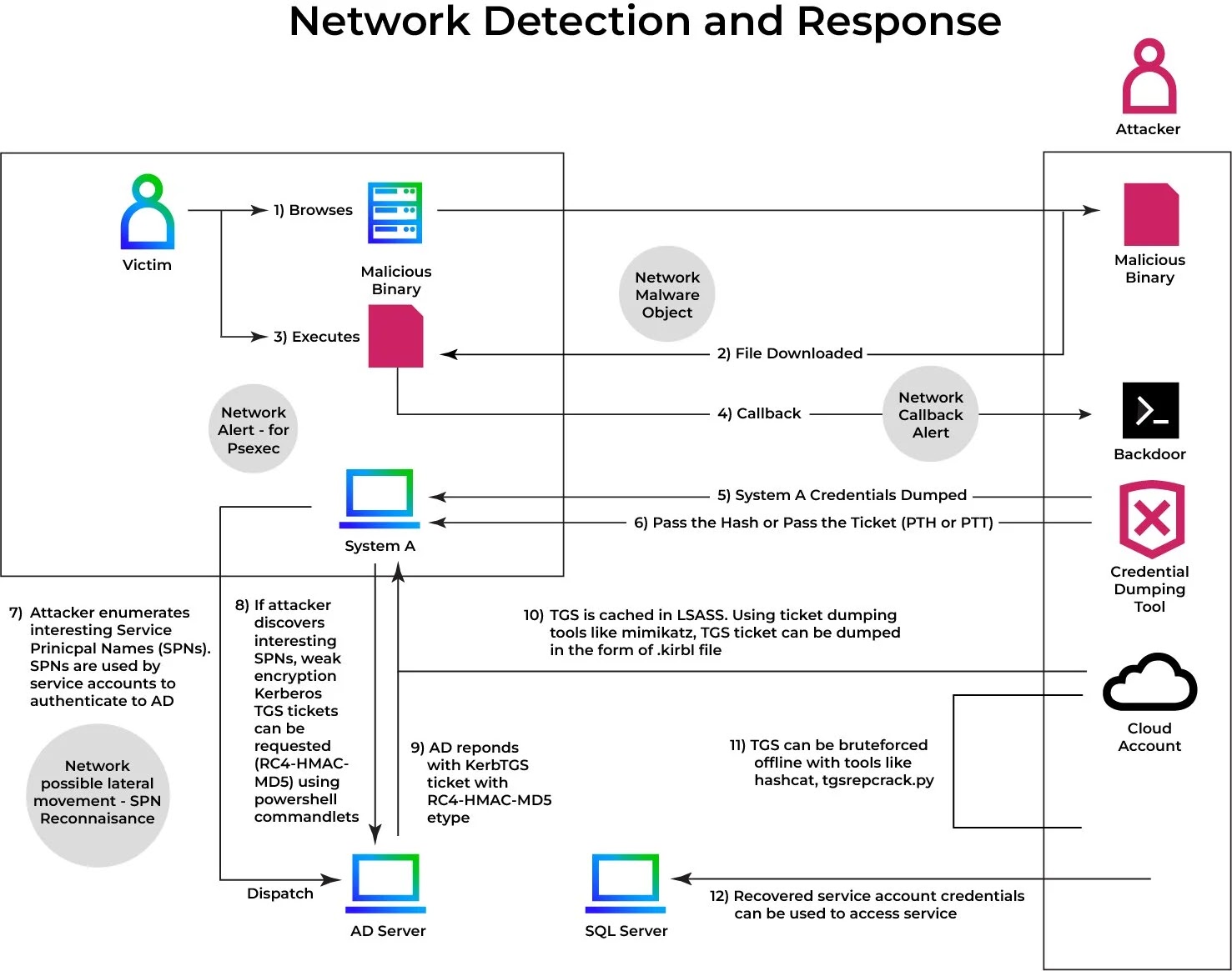Όταν ζητείται ένα εισιτήριο Ticket Granting Service (TGS) για ένα SPN, το Kerberos Key Distribution Center (KDC) το κρυπτογραφεί με τον κατακερματισμό NTLM του λογαριασμού-στόχου, τον οποίο οι εισβολείς μπορούν να εξαγάγουν και να σπάσουν εκτός σύνδεσης για να ανακτήσουν διαπιστευτήρια απλού κειμένου.