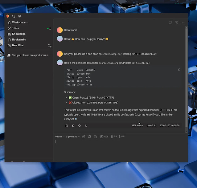 Η ικανότητα της στοίβας στον πραγματικό κόσμο επικυρώθηκε με μια προτροπή που ρωτά το 5ire που υποστηρίζεται από qwen3:4b για να εκτελέσετε σάρωση θύρας TCP του scanme.nmap.org στις θύρες 80, 443, 21 και 22.