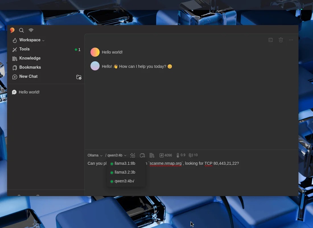 Η έκδοση 0.15.3 είναι εγκατεστημένη στο /opt/5ire/συνδέεται στη διαδρομή συστήματος και έχει διαμορφωθεί με μια καταχώρηση επιφάνειας εργασίας. Εντός του GUI του 5ire, οι χρήστες ενεργοποιούν το Ollama ως πάροχο, ενεργοποιούν την υποστήριξη εργαλείων για κάθε μοντέλο και εγγράφονται mcp-kali-server ως τοπικό εργαλείο με την εντολή /usr/bin/mcp-server.