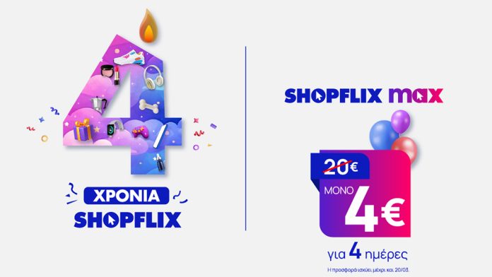 Το SHOPFLIX συμπληρώνει τέσσερα χρόνια παρουσίας και γιορτάζει μία ταχύτατη πορεία ανάπτυξης γεμάτη επιλογές, καθημερινές ανακαλύψεις και εμπιστοσύνη από εκατομμύρια καταναλωτές σε όλη την Ελλάδα.