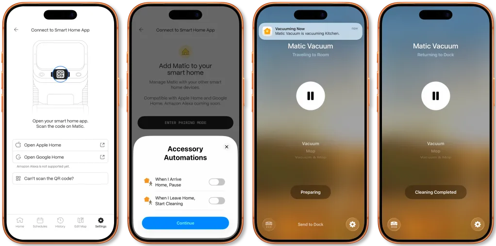Το Matic εκθέτει επίσης τρεις λειτουργίες καθαρισμού στο Apple Home: Γρήγορο, Βαθύ καθαρισμό και Αυτόματο.