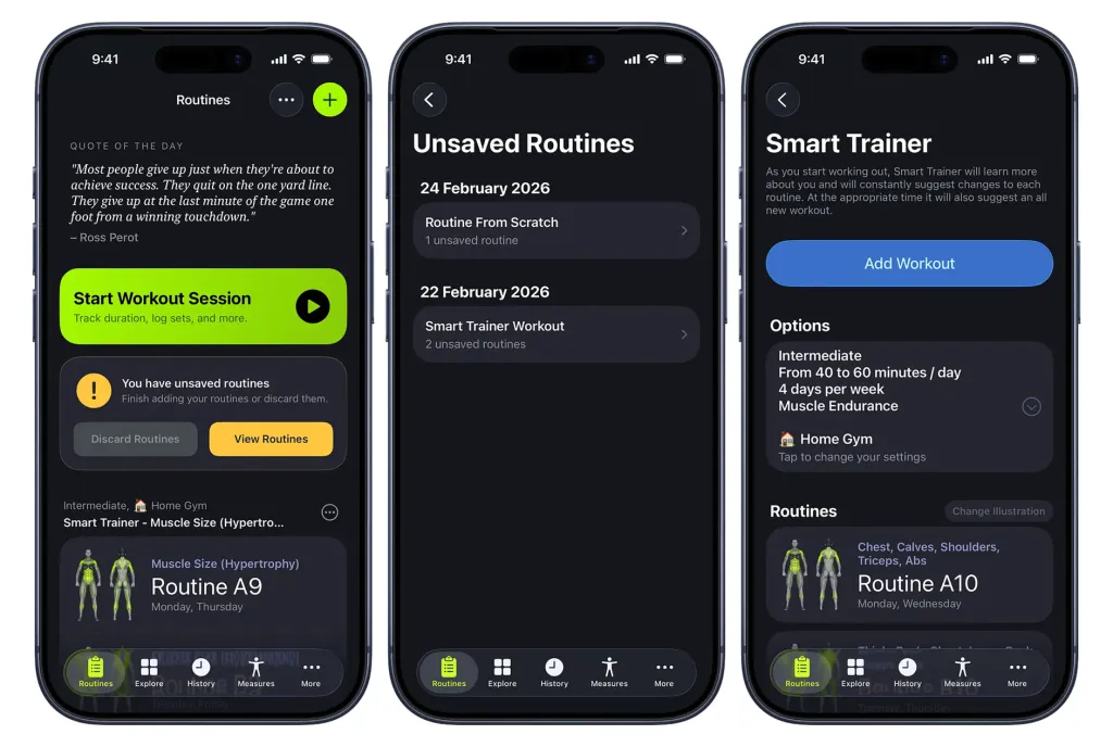 Και μιλώντας για το Smart Trainer του SmartGym, οι χρήστες μπορούν να το ρυθμίσουν ώστε να μην αντικαθιστά ποτέ αυτόματα τις ρουτίνες προπόνησης με νέες. Ωστόσο, SmartGym προτείνει στους χρήστες να «εξετάσουν περιστασιακές πλήρεις ενημερώσεις» για να αποφύγουν το πλάτωμα προόδου.