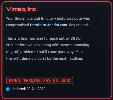 Η παραβίαση έχει χαρακτηριστεί από τη διαβόητη ομάδα εκβιαστών ShinyHunters, οι οποίοι απείλησαν να δημοσιεύσουν τα κλεμμένα δεδομένα εάν δεν πληρωθεί λύτρο. Στο πλαίσιο αυτό, η ShinyHunters έχει δημοσιεύσει το Vimeo στην πύλη εκβιασμών τους, ισχυριζόμενη ότι έχουν πρόσβαση σε δεδομένα από σημαντικές περιπτώσεις της εταιρείας, όπως είναι οι πλατφόρμες Snowflake και BigQuery.