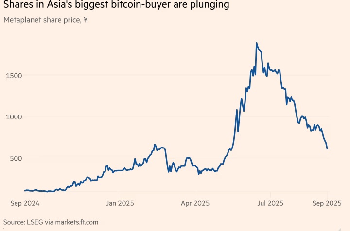 Η μετοχή της Metaplanet -της μεγαλύτερης κατόχου Βitcoin στην Ασία, που ξεκίνησε ως ξενοδοχειακή εταιρεία- έχει υποχωρήσει κατά 68% από το υψηλό που σημείωσε στα μέσα Ιουνίου, ενώ αυτή της Smarter Web Company -της πιο δραστήριας βρετανικής εταιρείας στις αγορές Βitcoin- έχει χάσει 70% την ίδια περίοδο.